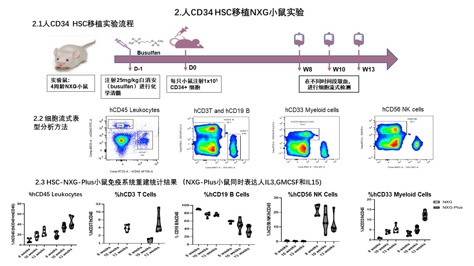 品系描述:Prkdc基因功能缺失導(dǎo)致V(D)J重組不能正常發(fā)生,造成T細(xì)胞和B細(xì)胞不能發(fā)育成熟,IL2Rg是多種白細(xì)胞介素細(xì)胞因子受體的共同亞基,IL2Rg失活則導(dǎo)致6種不同細(xì)胞因子信號通路缺失,造成NK細(xì)胞缺陷。NOD/Shilt遺傳背景使該品系具有天然免疫缺陷,如補體系統(tǒng)、巨噬細(xì)胞缺陷,因此,NXG是迄今為止免疫系統(tǒng)缺陷最為徹底的小鼠模型之一。